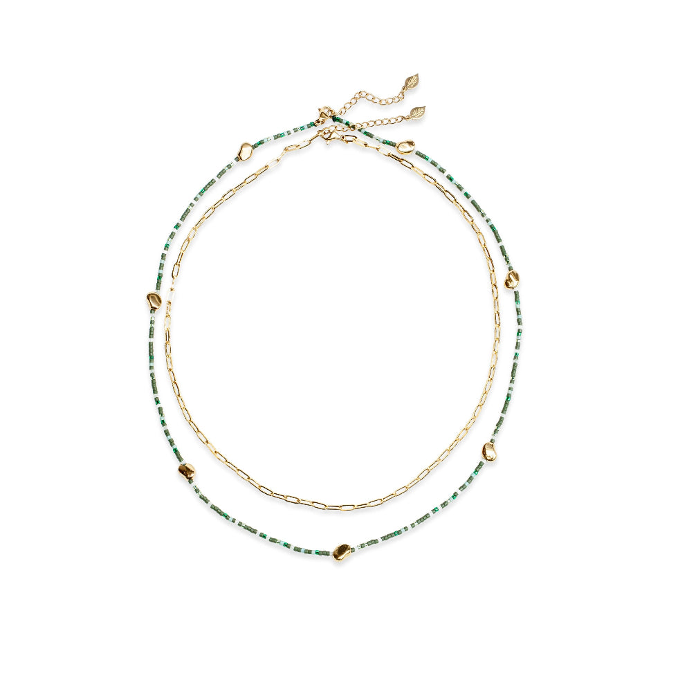 One hand-strung with mixed green glass beads and organically shaped 18K gold-plated stainless steel beads, 18.25"