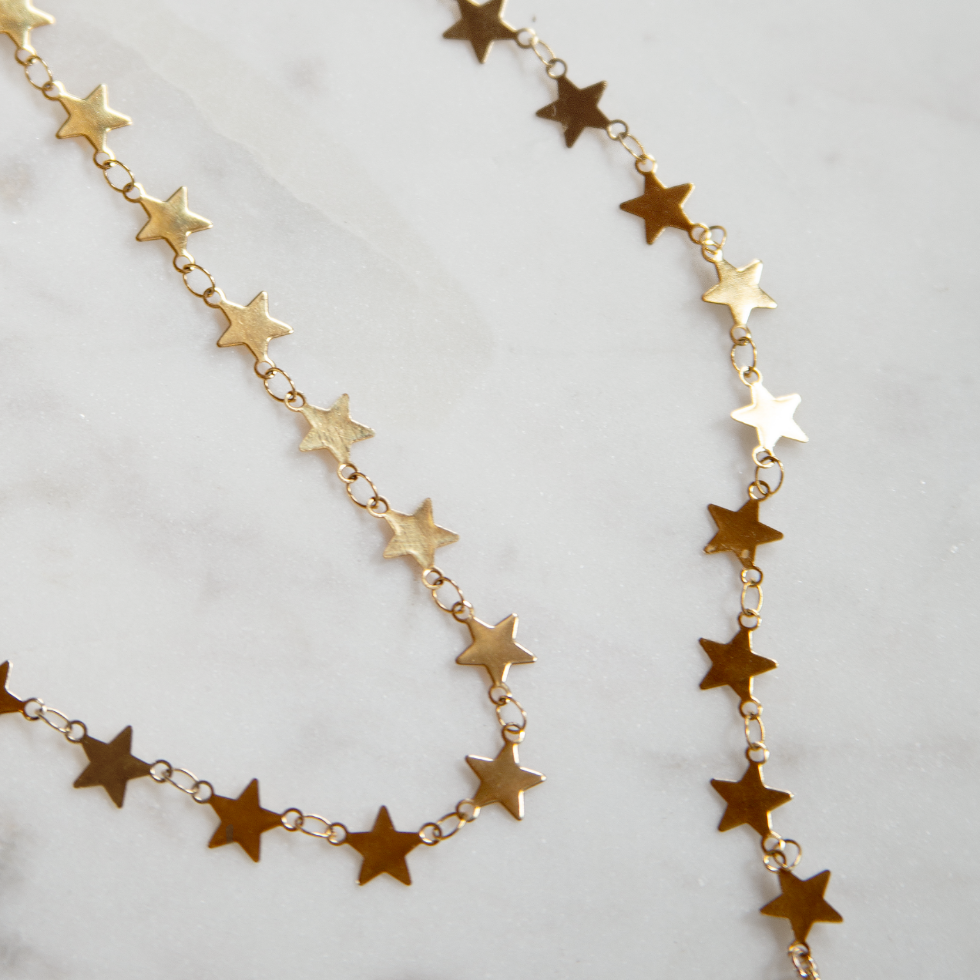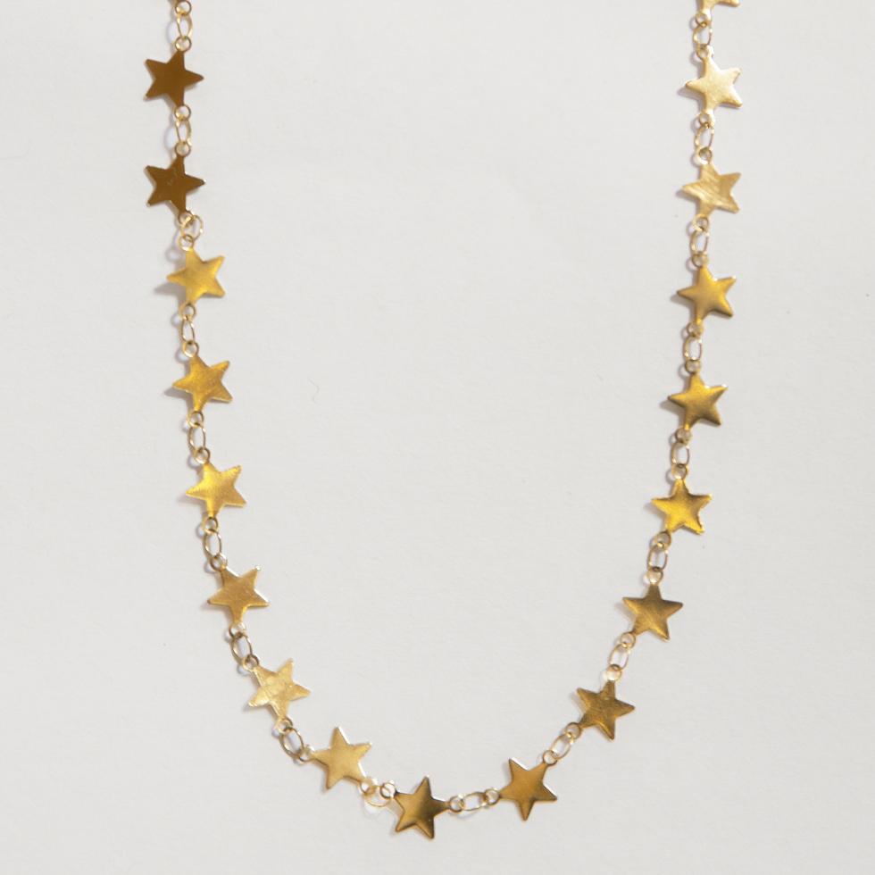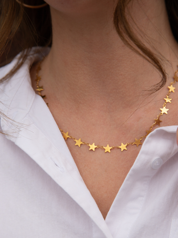 Shine a little brighter in the Celeste Necklace — a delicate gold chain dotted with tiny stars that catch the light and turn heads.