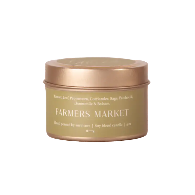 This 4 oz travel tin candle is made with soy blend wax, phthalate-free fragrance oils, clean-burning cotton wicks and is hand-poured by women survivors.