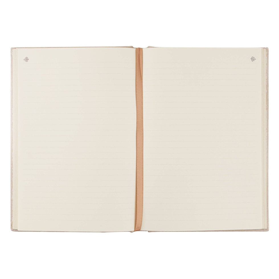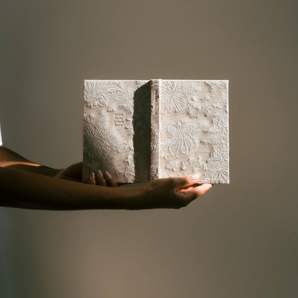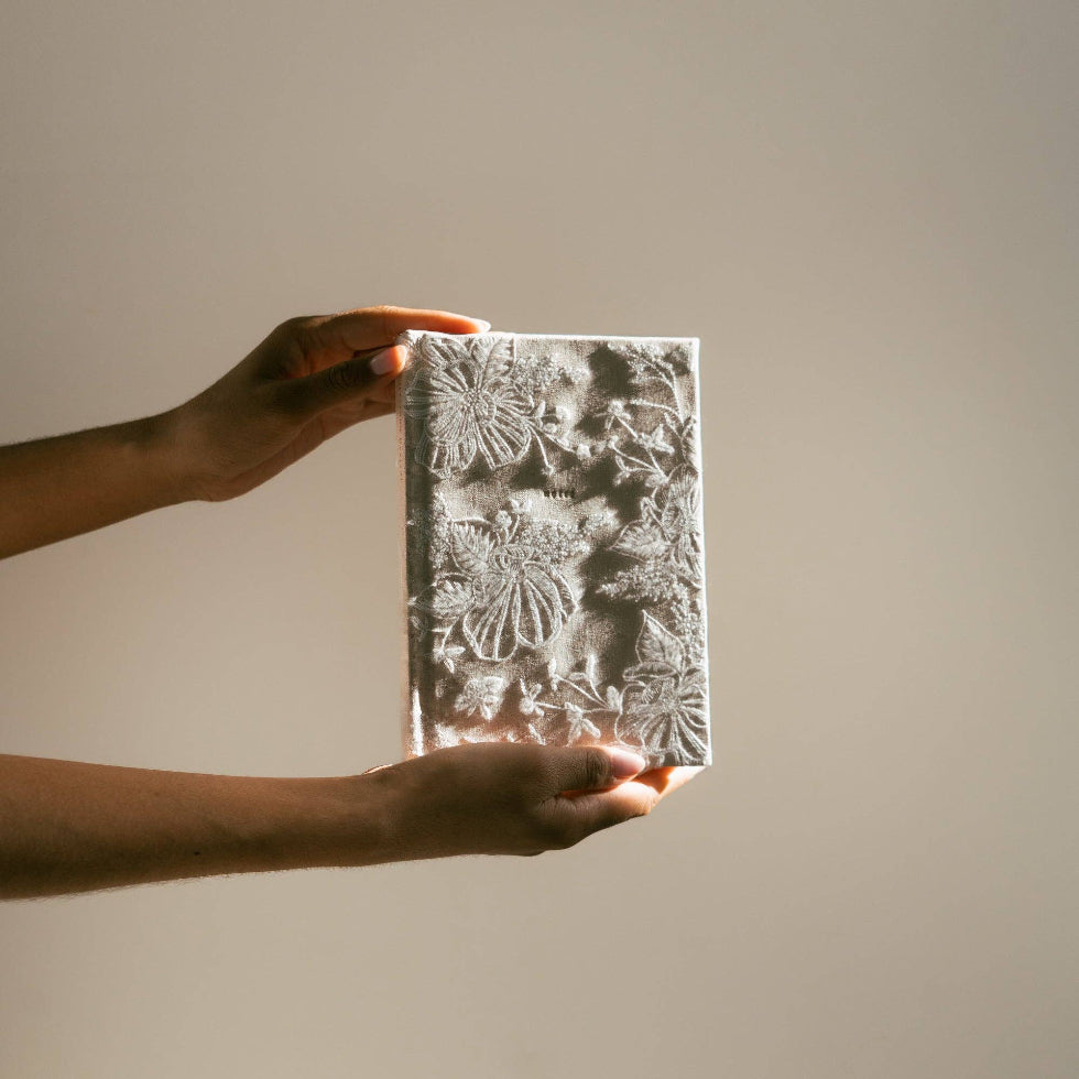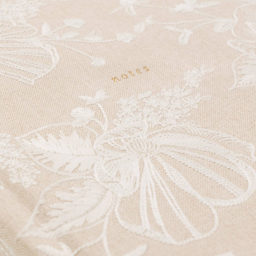 Outlines of delicate, white embroidered magnolias cover this notebook, giving it an elegant and elevated look, while gold-gilded pages give this notebook an extra touch of beauty.