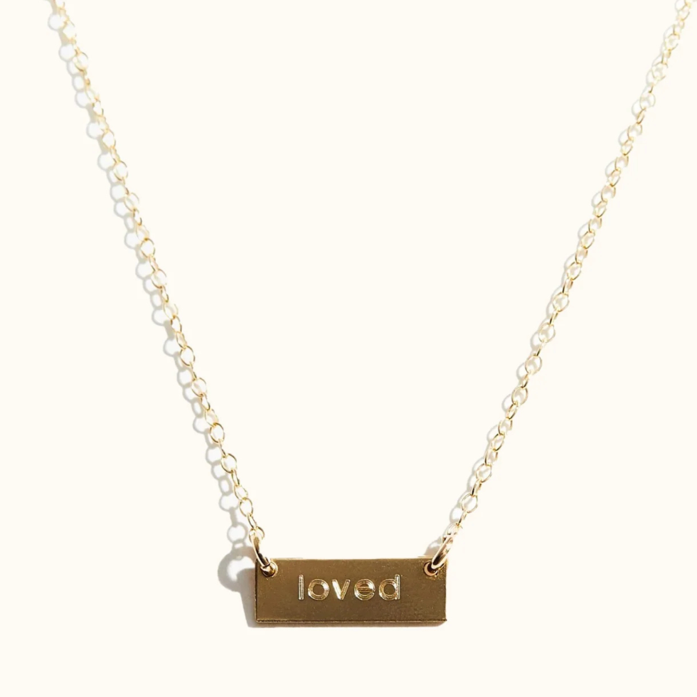 This necklace features a dainty bar that sits on a delicate chain engraved with the word "loved".