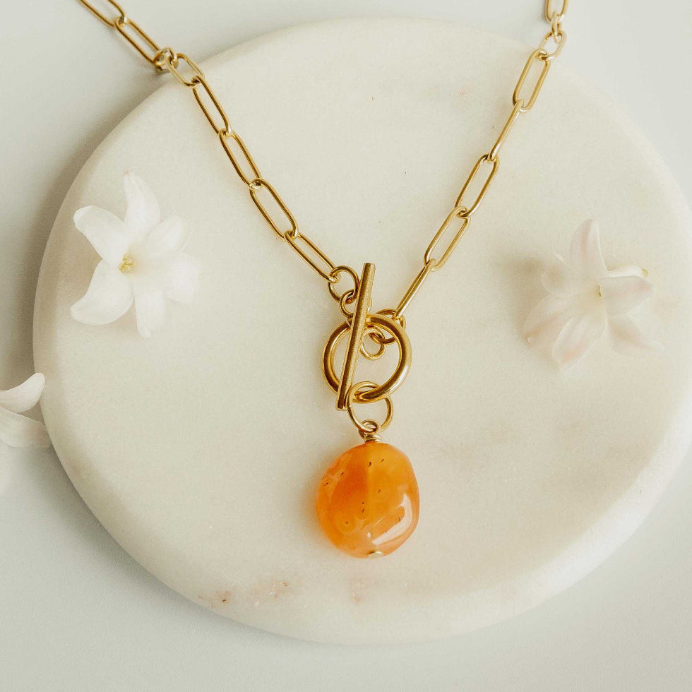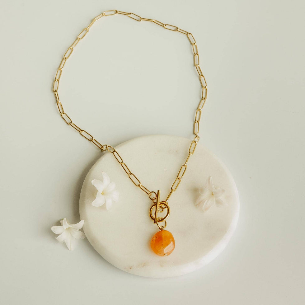 Our most popular paperclip chain necklace that gives back comes with a pop of orange apatite stone nugget!