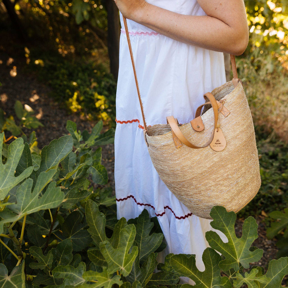 This handwoven palm leaf bucket handbag is great for day to day use with its crossbody shoulder strap and leather tote handles.