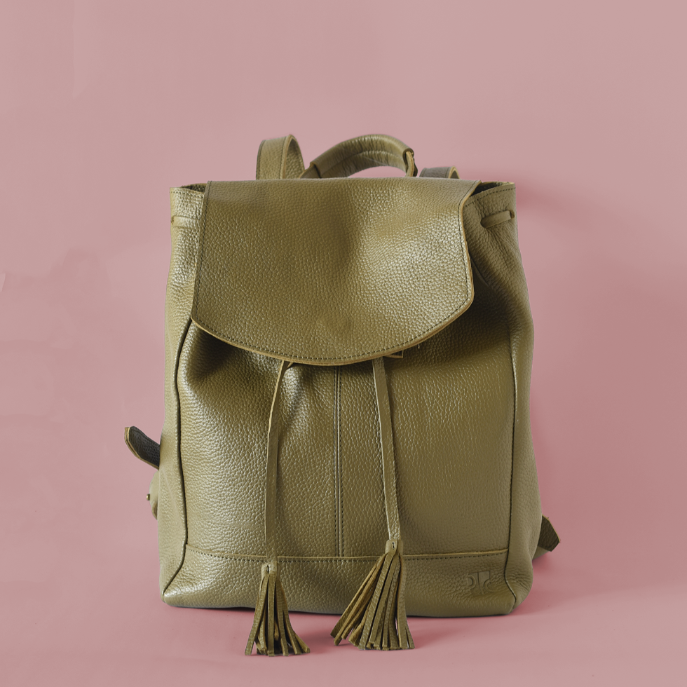 Add subtle color & style to your day with the Fair trade Tassel Backpack in Pebbled Olive Leather.